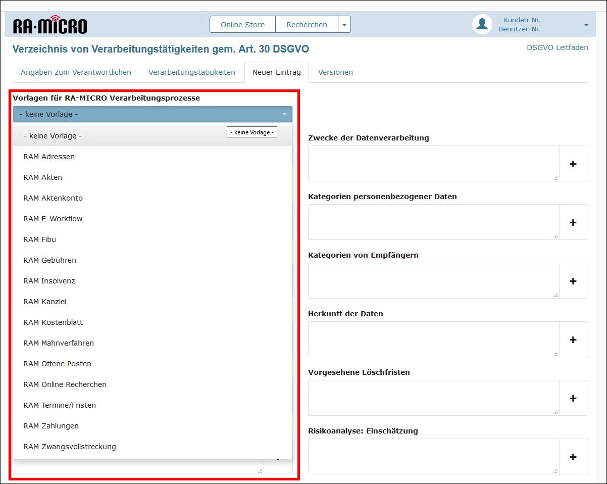 Nach Klick auf neuer Eintrag gelangt man in den nächste Bereich des Tools. RA-MICRO bietet hier eine Vielfalt an Vorlagen für die in RA-MICRO nutzbaren Verarbeitungstätigkeiten. Dabei kann beispielsweise differenziert werden zwischen: