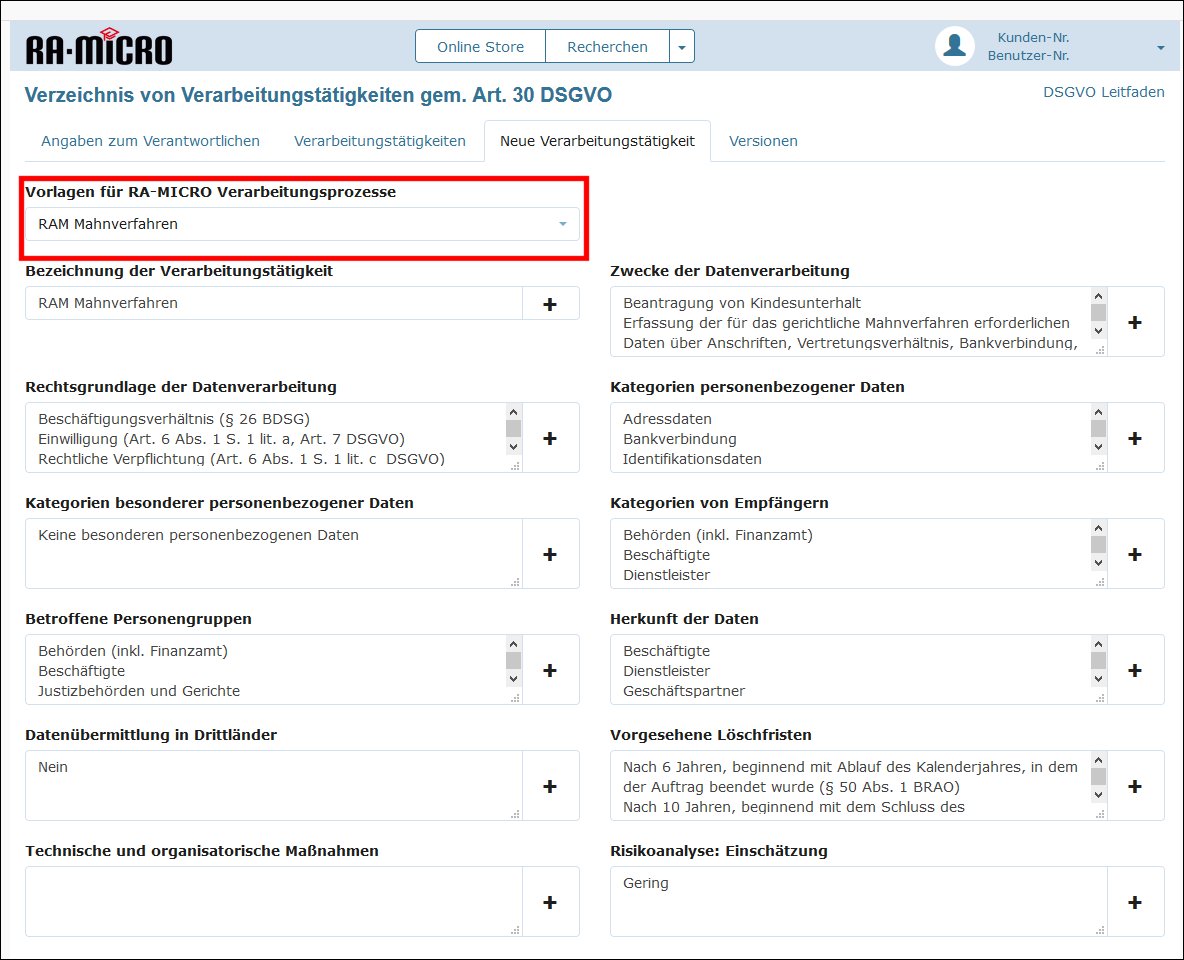 Nach Auswahl einer RA-MICRO Vorlage werden nun die datenschutzrelevanten Angaben zur jeweiligen Tätigkeit aufgeführt. Hier finden sich beispielsweise Angabe zu: