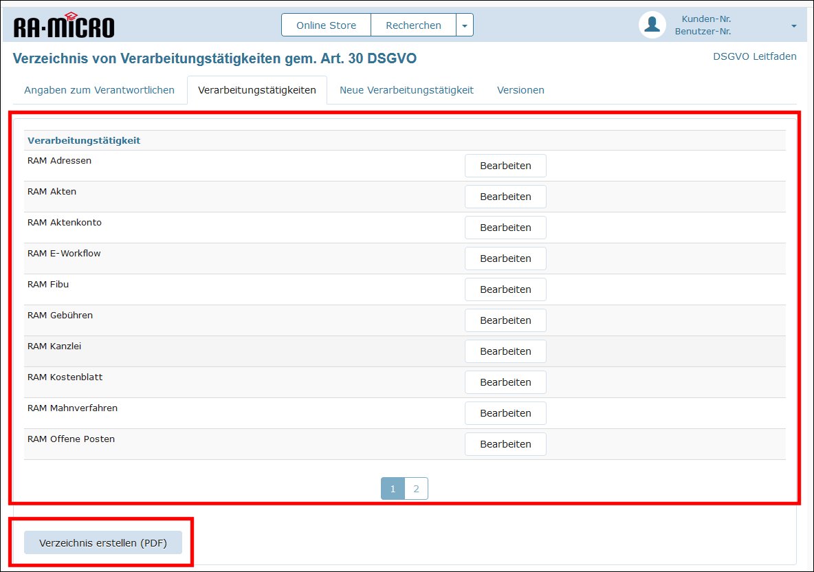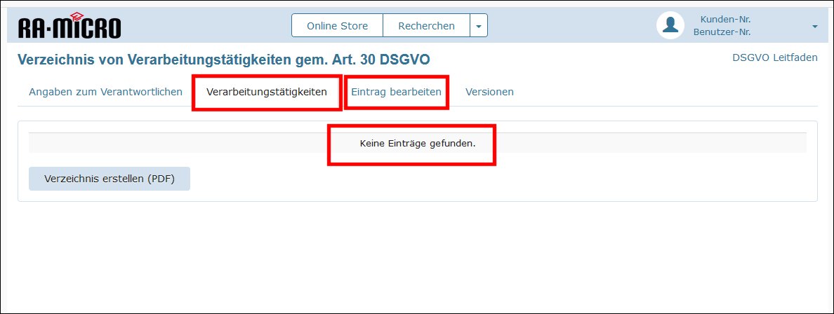 Den Link zum Erstellen des Verarbeitungsverzeichnisses finden Sie im Menü recht oben, neben Ihrer Benutzer- bzw. Kundennummer.